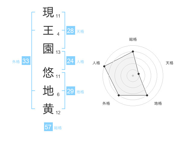 現王園 悠地黄さんを姓名の画数から五運を鑑定
