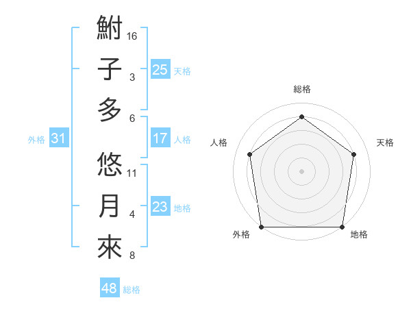 鮒子多 悠月來さんの外格は31画の5点!