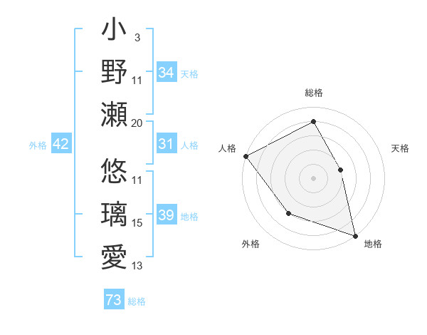 小野瀬 悠璃愛さんの総格は73画の4点!