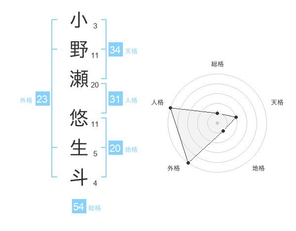 小野瀬 悠生斗さんの総格は54画の1点!