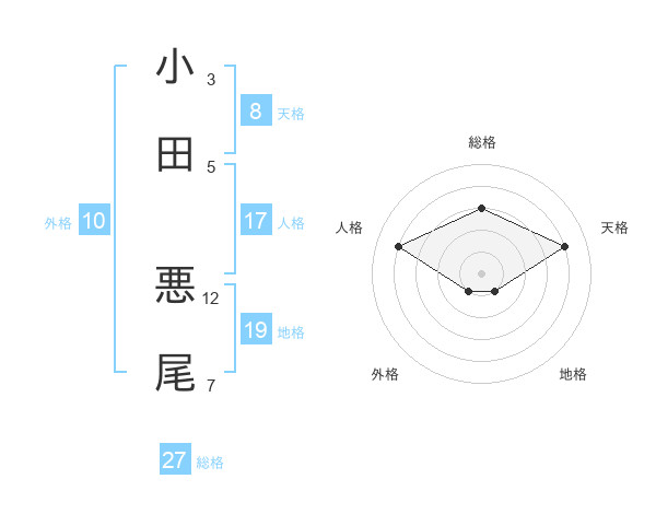 小田 悪尾さんの総格は27画の3点!