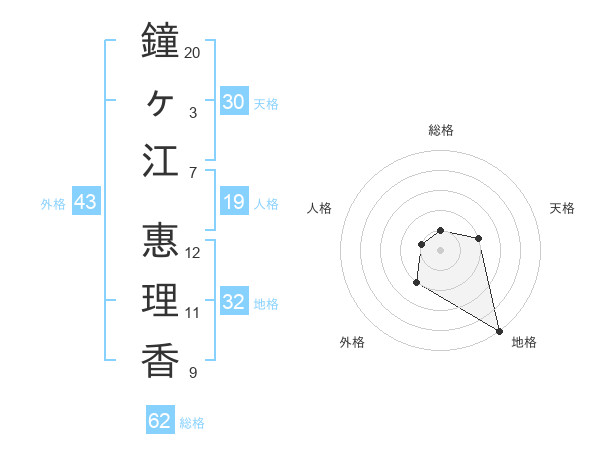 鐘ヶ江 惠理香さんの地格は32画の5点!