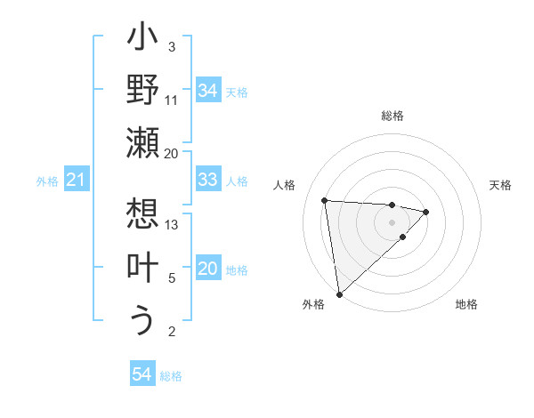 小野瀬 想叶うさんを姓名の画数から五運を鑑定