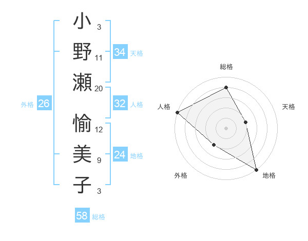 小野瀬 愉美子さんの総格は58画の4点!