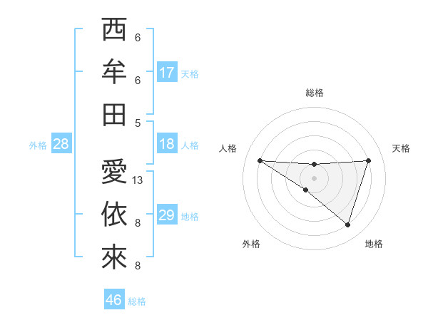 西牟田 愛依來さんの天格は17画の4点!