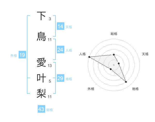 下鳥 愛叶梨さんの総格は43画の2点!