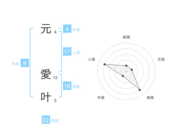 元 愛叶さんの総格は22画の1点!