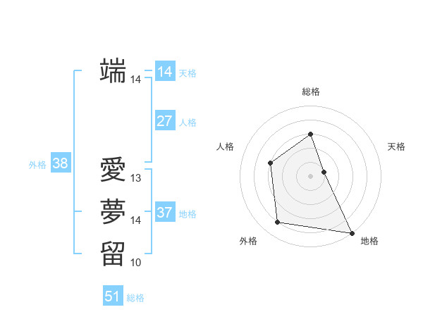 端 愛夢留さんの総格は51画の3点!