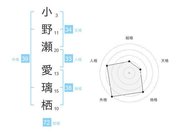 小野瀬 愛璃栖さんの総格は72画の2点!