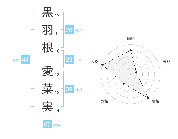 黒羽根 愛菜実さんの総格は67画の4点!