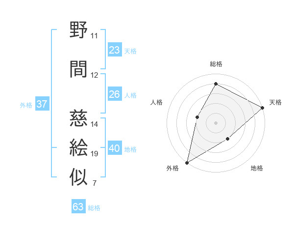 野間 慈絵似さんの総格は63画の4点!