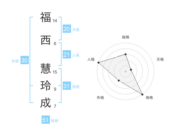 福西 慧玲成さんの総格は51画の3点!
