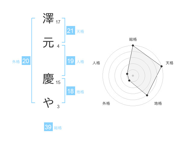 澤元 慶やさんを姓名の画数から五運を鑑定