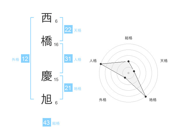 西橋 慶旭さんを姓名の画数から五運を鑑定