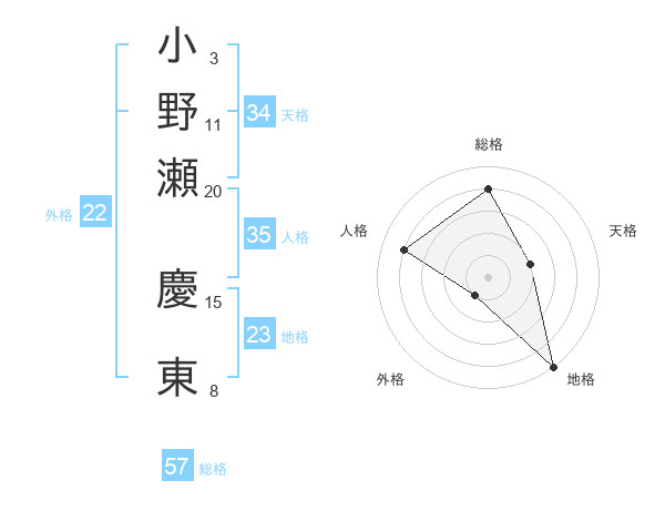 小野瀬 慶東さんを姓名の画数から五運を鑑定