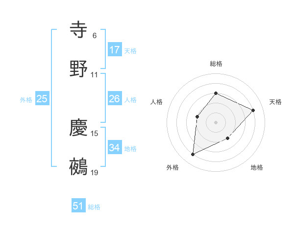 寺野 慶鵺さんの総格は51画の3点!