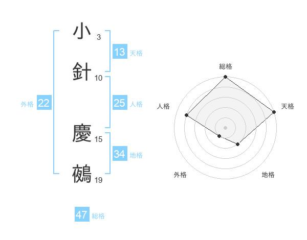 小針 慶鵺さんの総格は47画の5点!