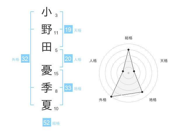 小野田 憂季夏さんを姓名の画数から五運を鑑定
