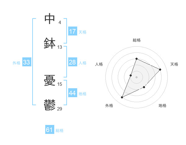 中鉢 憂鬱さんを姓名の画数から五運を鑑定