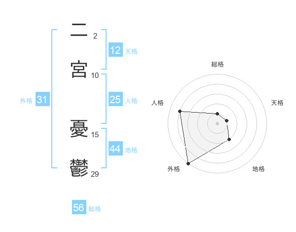 二宮 憂鬱さんを姓名の画数から五運を鑑定