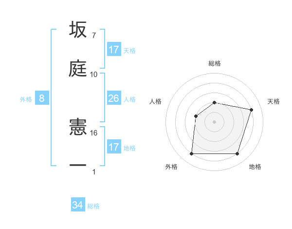 坂庭 憲一さんの総格は34画の2点!