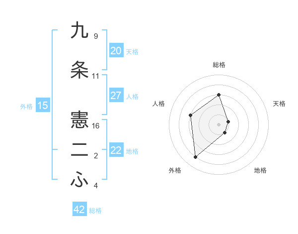 九条 憲二ふさんを姓名の画数から五運を鑑定