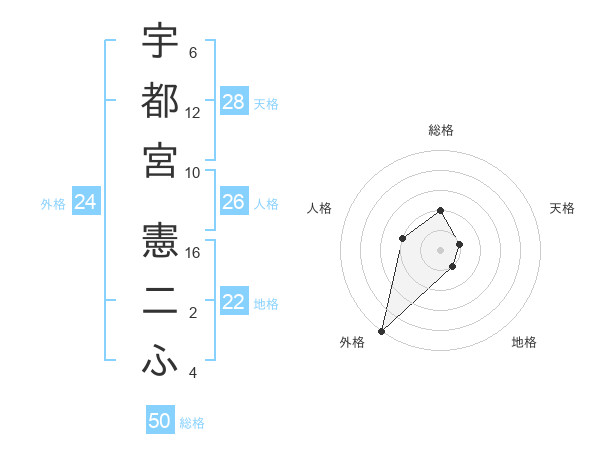 宇都宮 憲二ふさんを姓名の画数から五運を鑑定