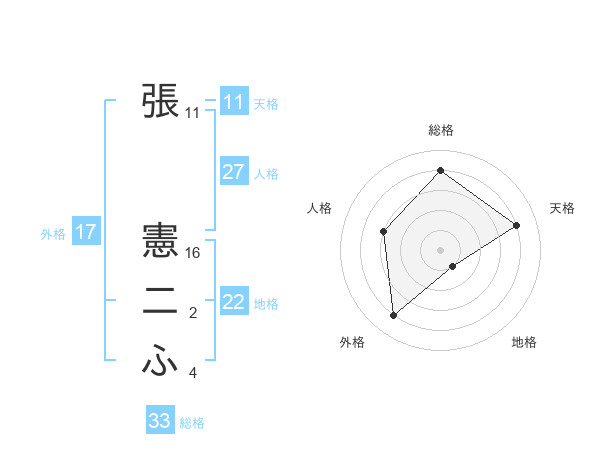 張 憲二ふさんを姓名の画数から五運を鑑定