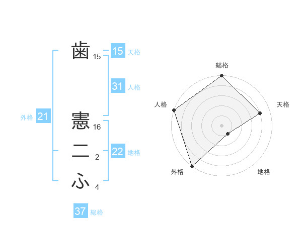 歯 憲二ふさんの外格は21画の5点!
