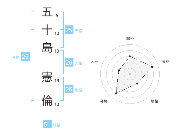 五十島 憲倫さんの総格は51画の3点!