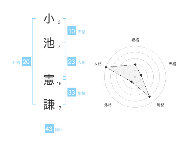 小池 憲謙さんの総格は43画の2点!