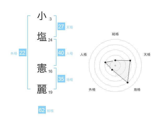 小塩 憲麗さんの総格は62画の1点!
