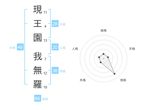 現王園 我無羅さんの総格は66画の1点!