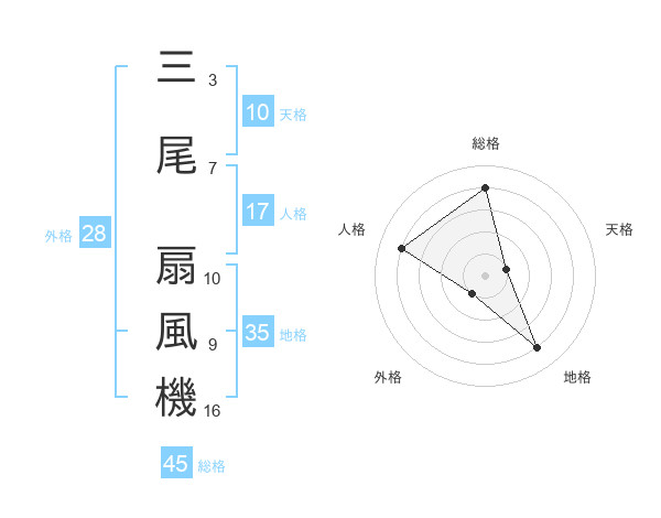 三尾 扇風機さんを姓名の画数から五運を鑑定