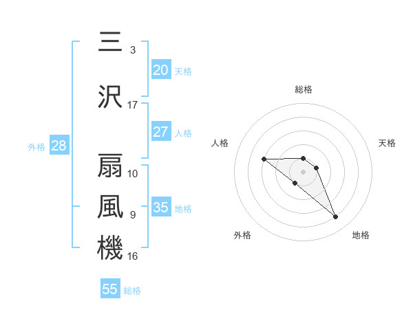三沢 扇風機さんを姓名の画数から五運を鑑定