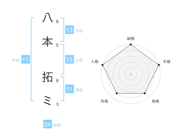 八本 拓ミさんの天格は13画の5点!