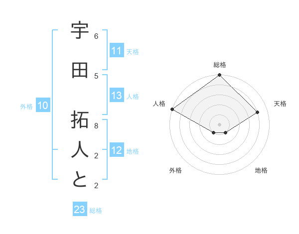 宇田 拓人とさんを姓名の画数から五運を鑑定