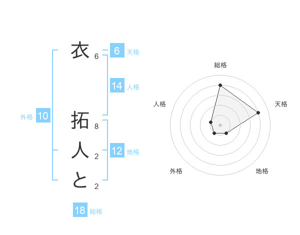衣 拓人とさんの総格は18画の4点!