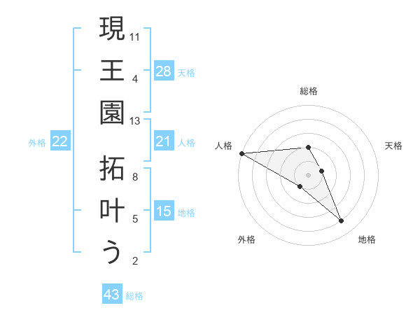 現王園 拓叶うさんの総格は43画の2点!