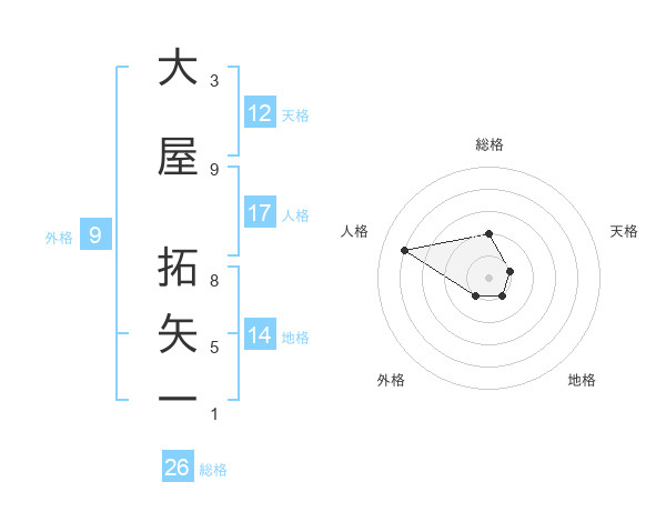 大屋 拓矢一さんを姓名の画数から五運を鑑定