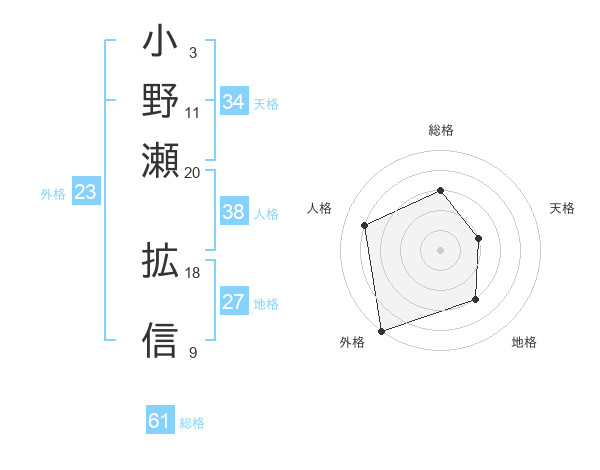 小野瀬 拡信さんを姓名の画数から五運を鑑定