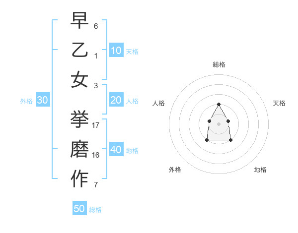 早乙女 挙磨作さんの総格は50画の2点