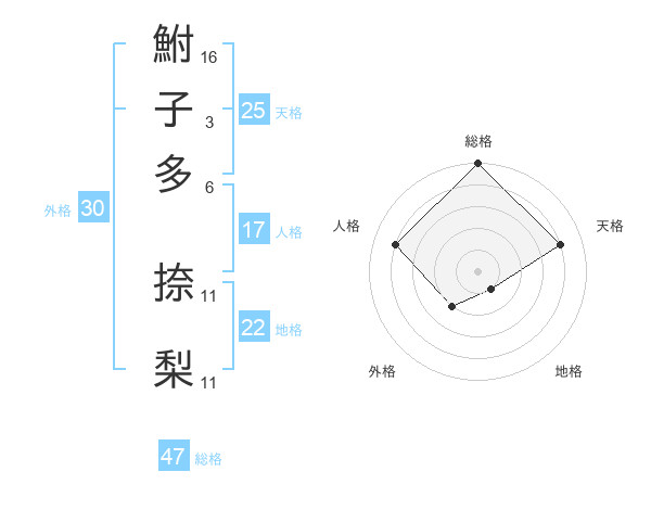 鮒子多 捺梨さんを姓名の画数から五運を鑑定