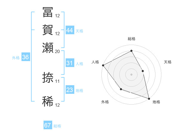 冨賀瀬 捺稀さんの総格は67画の4点!