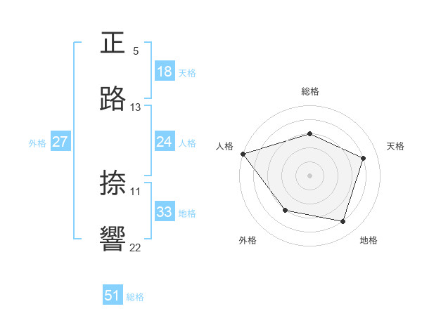 正路 捺響さんの総格は51画の3点!