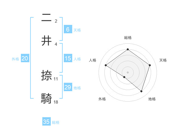 二井 捺騎さんを姓名の画数から五運を鑑定