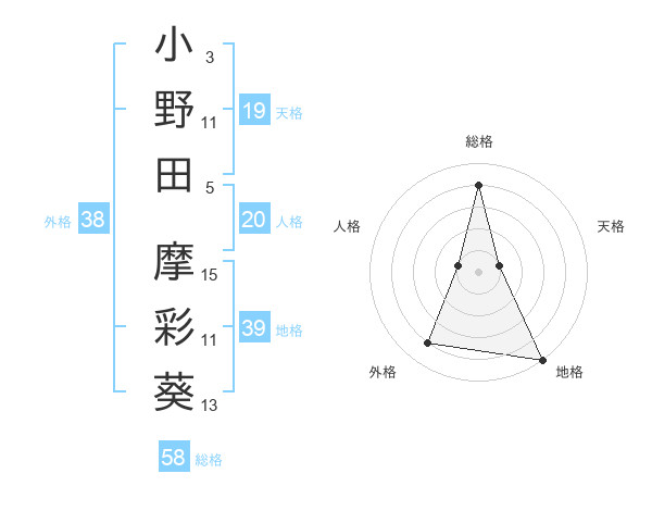 小野田 摩彩葵さんの外格は38画の4点!