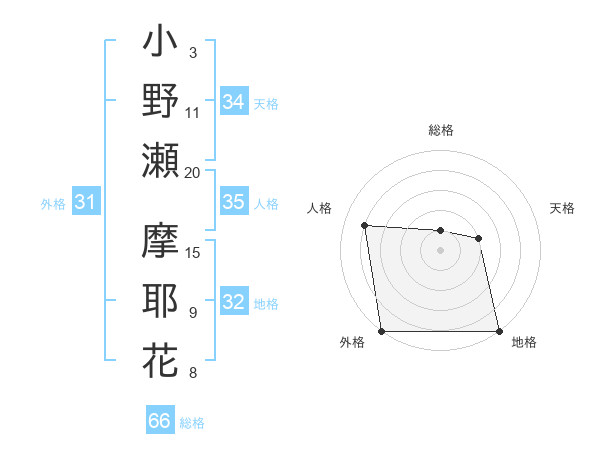 小野瀬 摩耶花さんの外格は31画の5点!