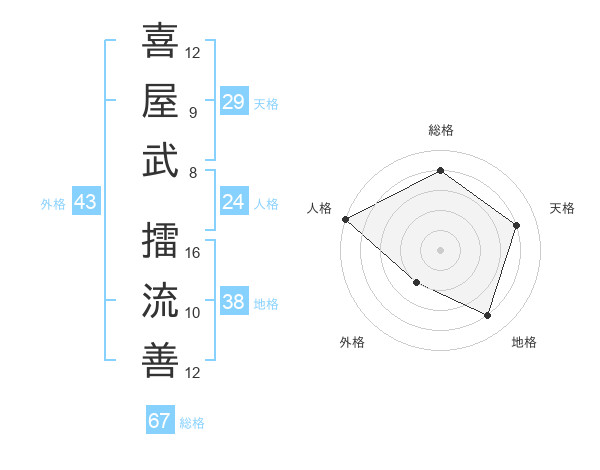 喜屋武 擂流善さんを姓名の画数から五運を鑑定