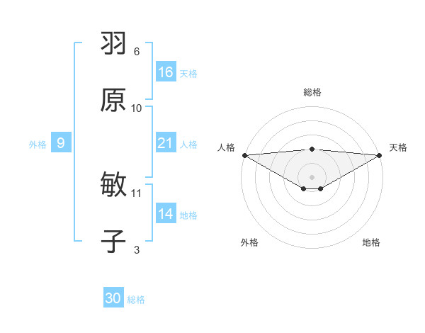 羽原 敏子さんの天格は16画の5点!